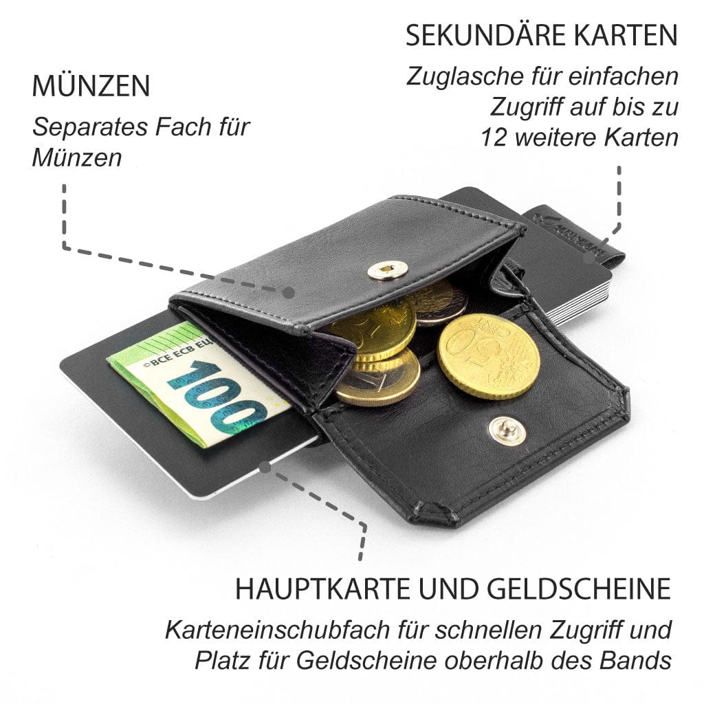 Mit einem Zug am Nano Boy Geldbeutel erreichst Du ganz einfach die 4 Karten, die Du am häufigsten benötigst.
