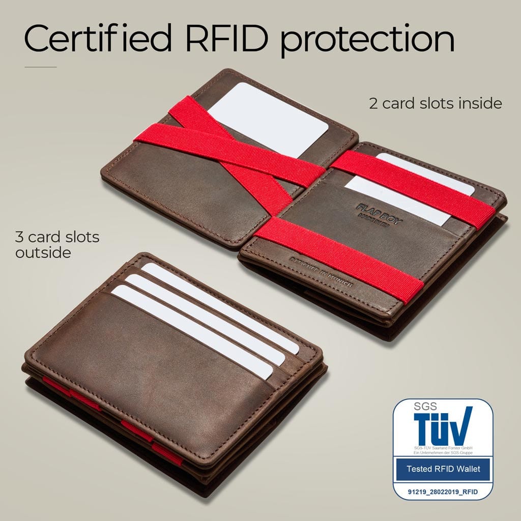 The Flap Boy has a large coin compartment. Therefore it is thicker than the Flap Boy Slim and has 3 credit card slots less. The Flap Boy Slim has no coin compartment. Otherwise, both models are identical. The Flap Boy XL has the same large coin compartment as the Flap Boy but offers an additional card compartment with a pull tab for 6 cards. In addition, the card slots of the Flap Boy XL are all inside the wallet and not visible from the outside.