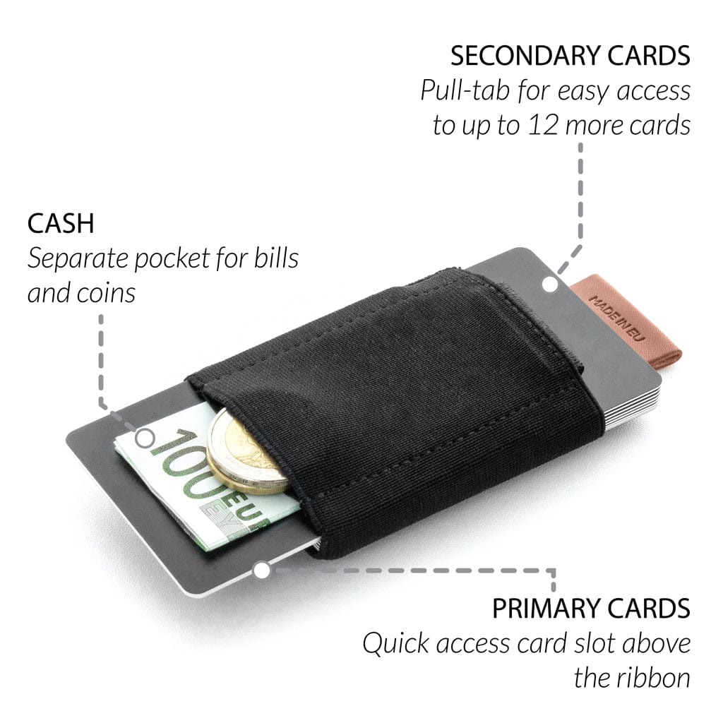 The Nano Boy Series can hold up to 13 cards. It has a main compartment with an innovative pull-tab mechanism for up to 12 cards and a compartment for direct access to the most used or the two most used cards.