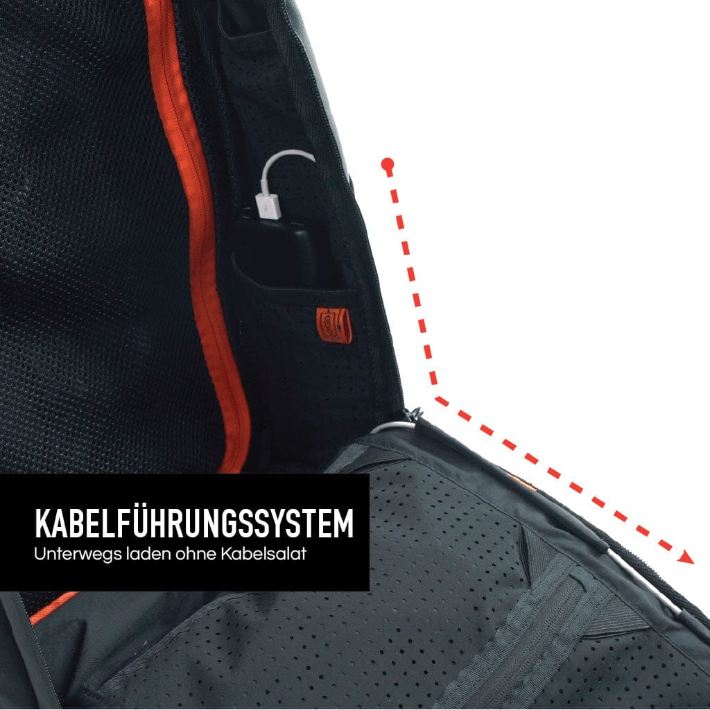 The main compartment has an integrated special pocket for a power bank as well as a cable management system.